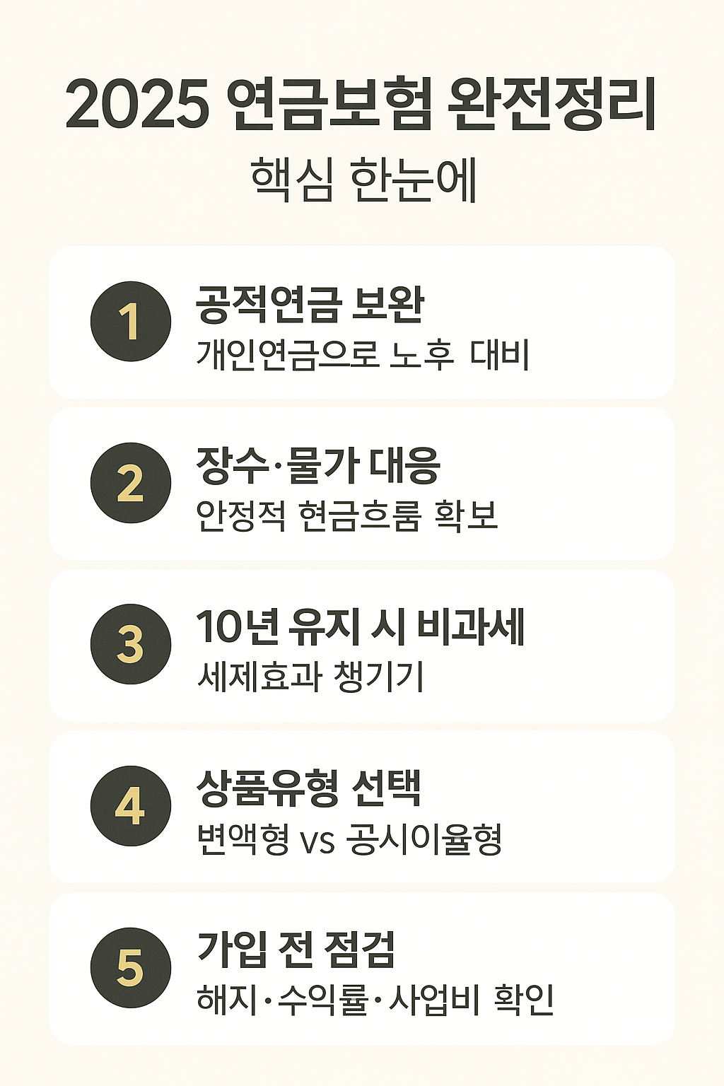 즉, 연금보험은 ‘노후소득 안정장치’로 훌륭하지만, 내 재무목표와 현금흐름 구조에 맞게 포트폴리오를 구성해야 합니다.