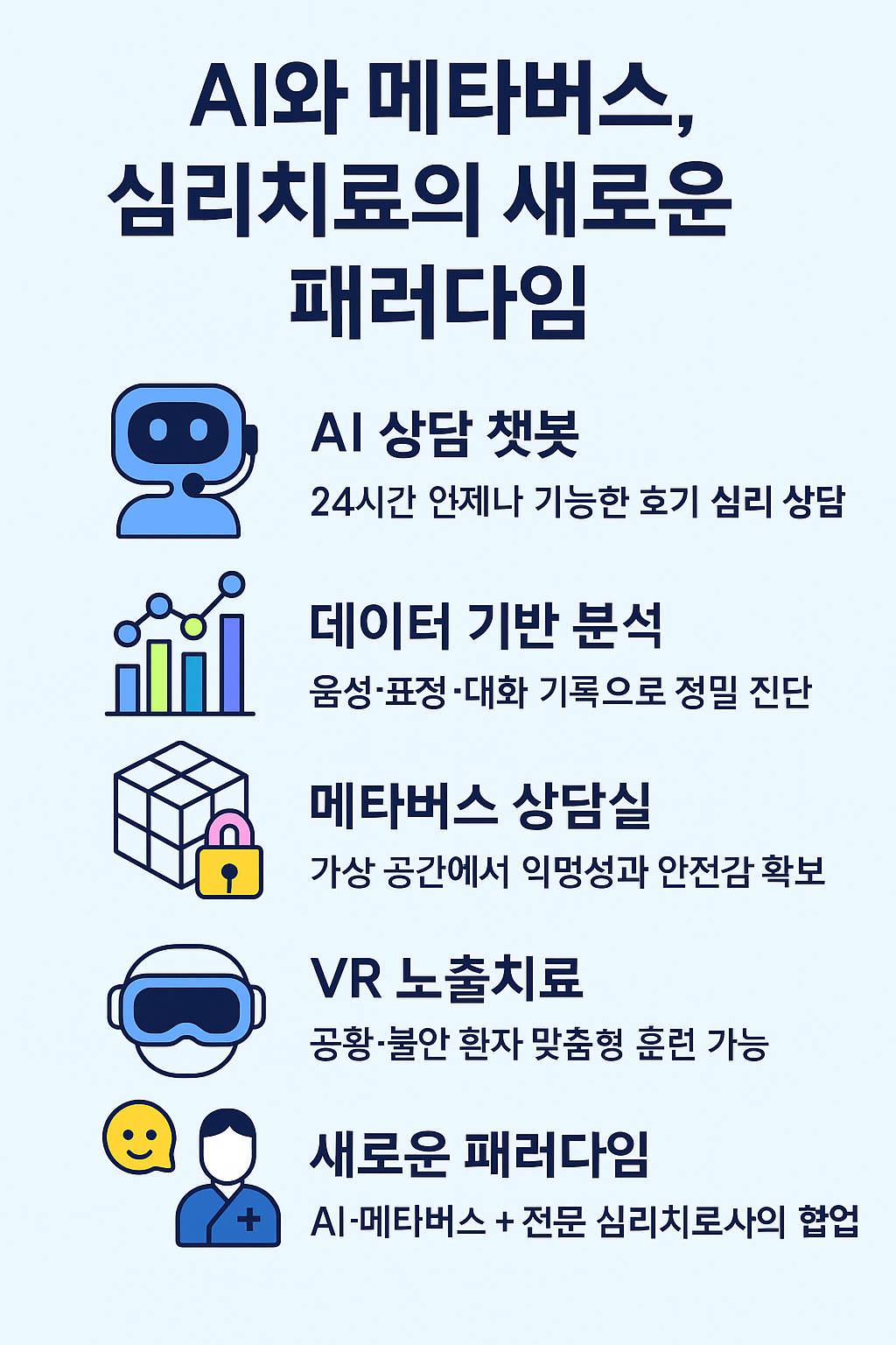 👉 따라서 AI와 메타버스는 기존 심리치료를 대체하기보다는 보완하는 역할에 가깝습니다.